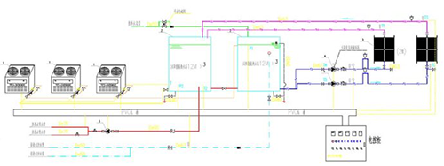 通过太阳能集热器吸收太阳能,将光能转化为热能,使冷水在集热器内被加热;被加热的热水进入到保温水箱中储存待用;空气能作为辅热热源在太阳能光照不足时启动,辅助热水供应;在大型的太阳能中央热水系统中,空气源热泵无疑是一种比较理想的辅助加热设备,为了改善空气源热泵在低温环境下制热运行的性能,大限度的利用太阳能,解决阴雨天气及冬季环境温度较低太阳能资源不足时热水供应保证率,做到全年、全天候供应热水。